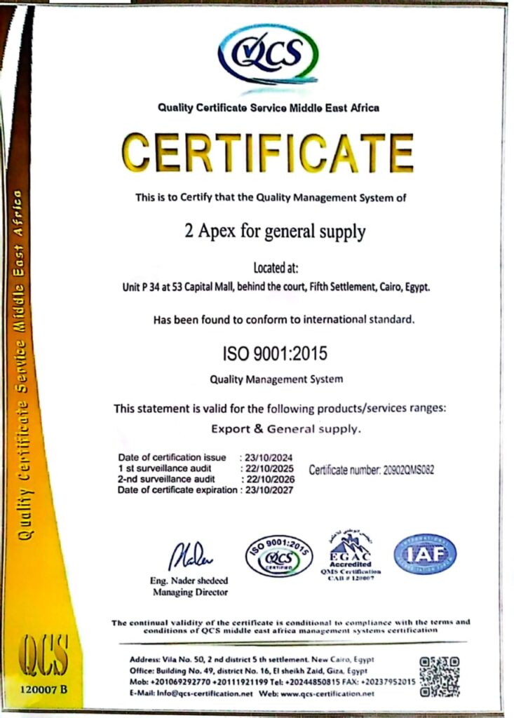We pride ourselves on sourcing only the finest crops from Egypt, renowned for their distinctive taste and superior quality. With a strong focus on sustainability and freshness, 2apex ensures that each shipment meets the highest international standards.